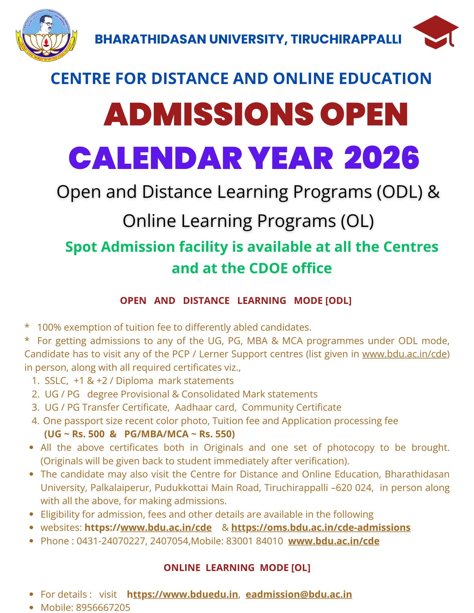 The Centre for Distance and Online Education (CDOE) of Bharathidasan University (BDU) established in the year 1992 to serve the students who could not enter the regular colleges for higher education. As the educational programmes offered and the degrees awarded through distance mode are on par with the regular mode, qualitatively there is a demand for the programmes offered by the CDOE of Bharathidasan University.
