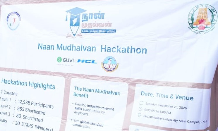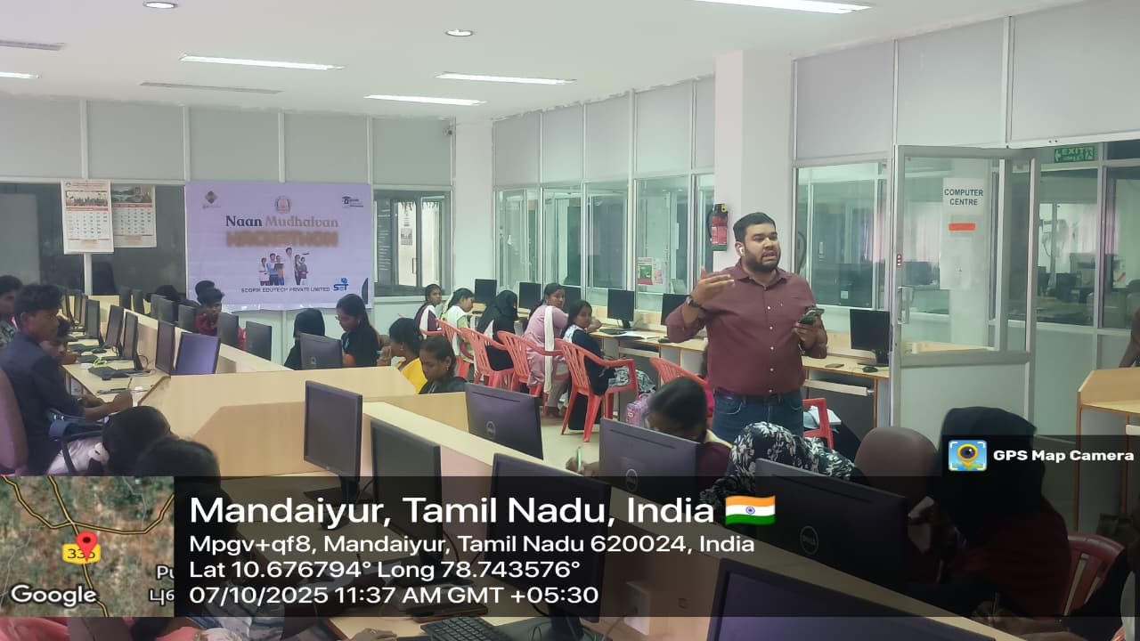 As a part of the Naan Mudhalvan Skill Development Programme, a Hackathon was organized by GUVI-HCL Ltd., Chennai for the Affiliated College Students of Bharathidasan University. 80+ students participated in the technical event.