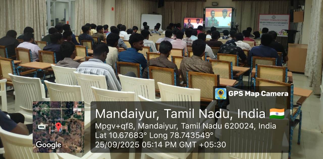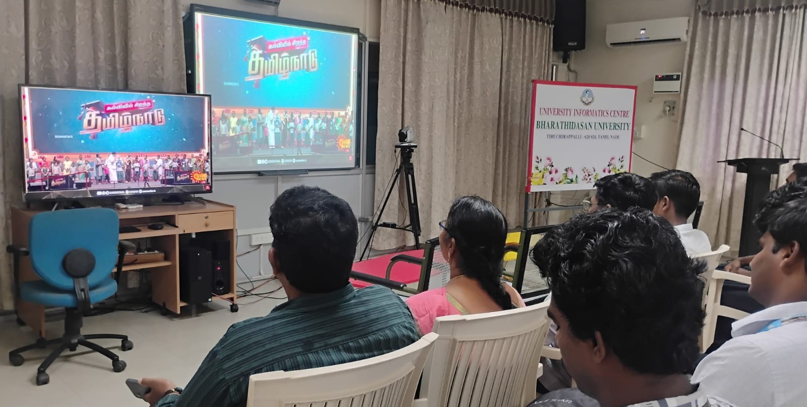 Celebration of Tamil Nadu's great educational achievement as 'கல்வியில் சிறந்த தமிழ்நாடு' was held on September 25th at the Nehru Indoor Stadium, Chennai. The event was streamed live for the student's of Bharathidasan University in the Auditorium and the Video Conferencing Studio of Bharathidasan University. Over 400 students attended the event. The event organized by the Govt. of Tamil Nadu, depicted the success of several welfare initiatives, including the Chief Minister’s Breakfast Scheme, the Naan Mudhalvan Scheme, Puthumai Penn Scheme and Tamil Pudhalvan Scheme. Beneficiaries of the schemes were present at the event and they shared their experiences on how they had been empowered through government support.